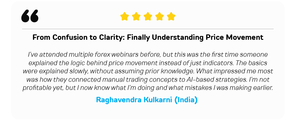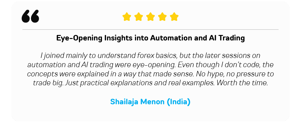With 8+ years of hands-on forex experience, she has trained 100+ traders and conducted 200+ seminars and workshops. Her training approach focuses on probability-based strategies, practical market insights, and disciplined trading, helping traders gain clarity, confidence, and consistency.